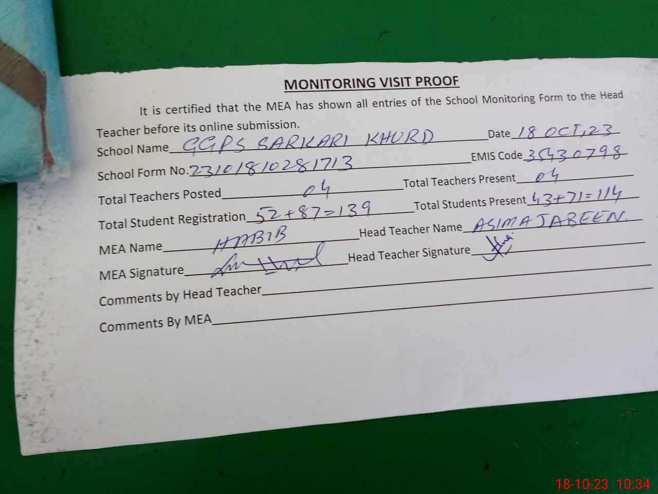 | Attendance Register | Head Teacher | MEA with School | Visit Proof |