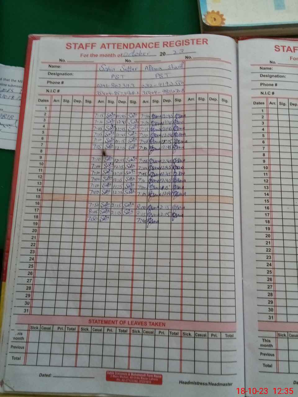 | CNIC | Full Name | Designation | R/C | Absence During Last Calender Month |