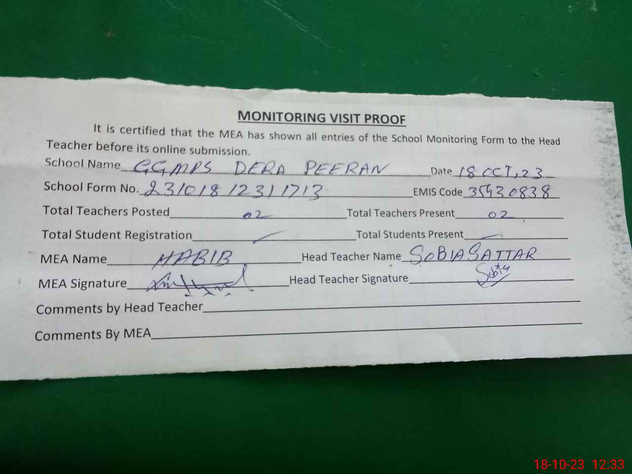| Attendance Register | Head Teacher | MEA with School | Visit Proof |