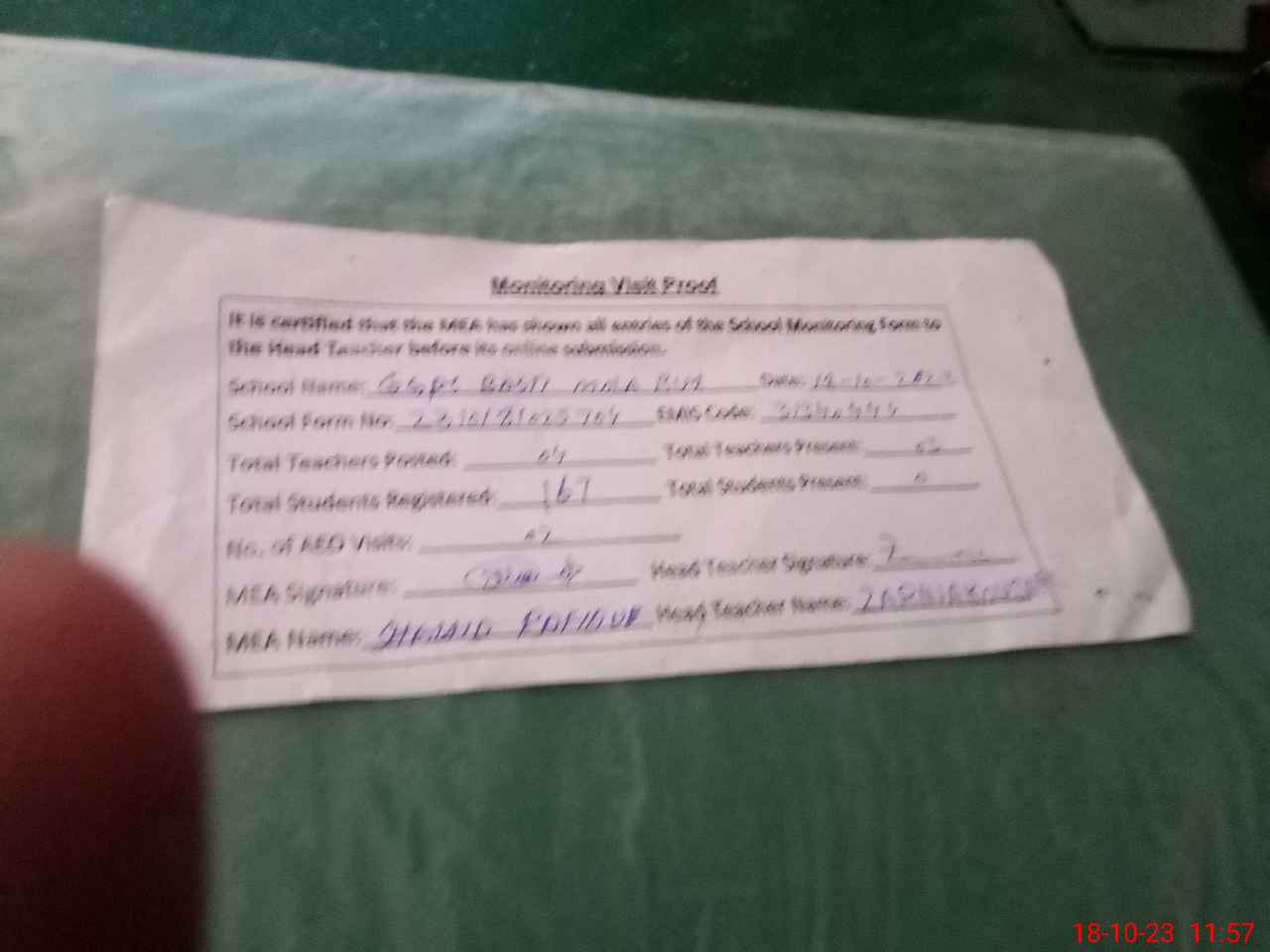 | Attendance Register | Head Teacher | MEA with School | Visit Proof |
