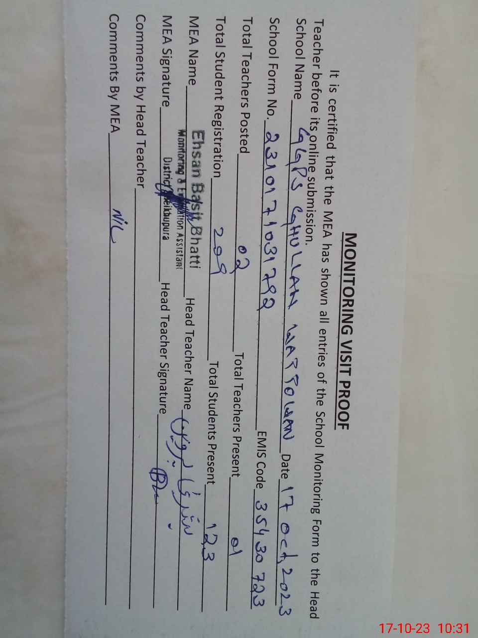 | EMIS Code: 35430723 | Name of School: GGPS GHULLAH WATTOWAN | |||