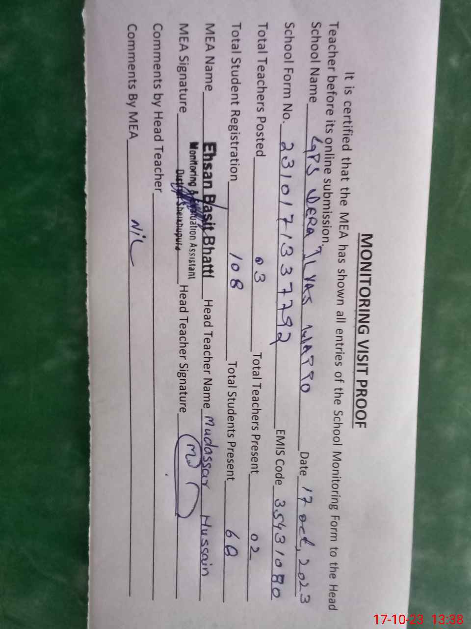 | Attendance Register | Head Teacher | MEA with School | Visit Proof |