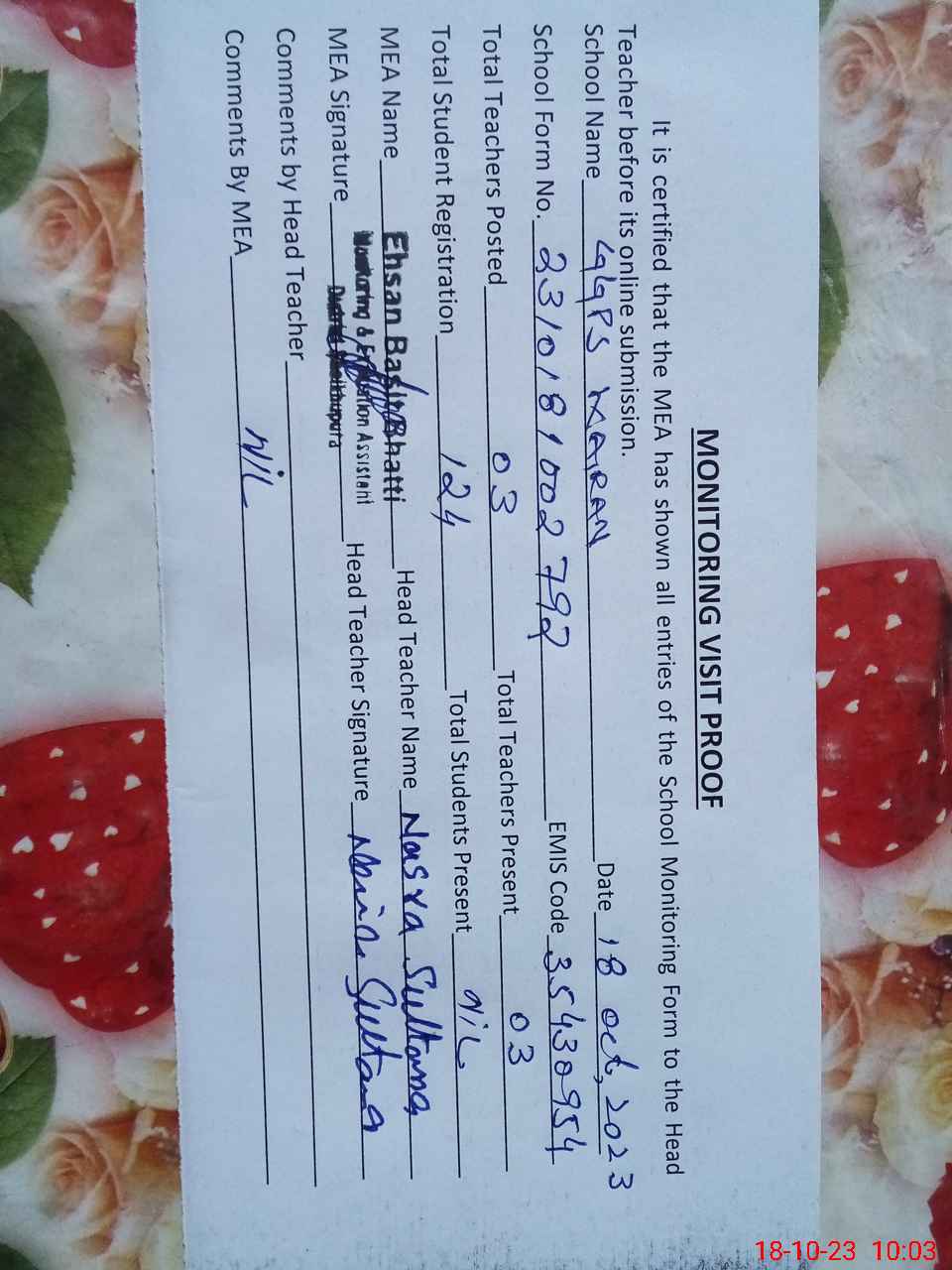 | Attendance Register | Head Teacher | MEA with School | Visit Proof |