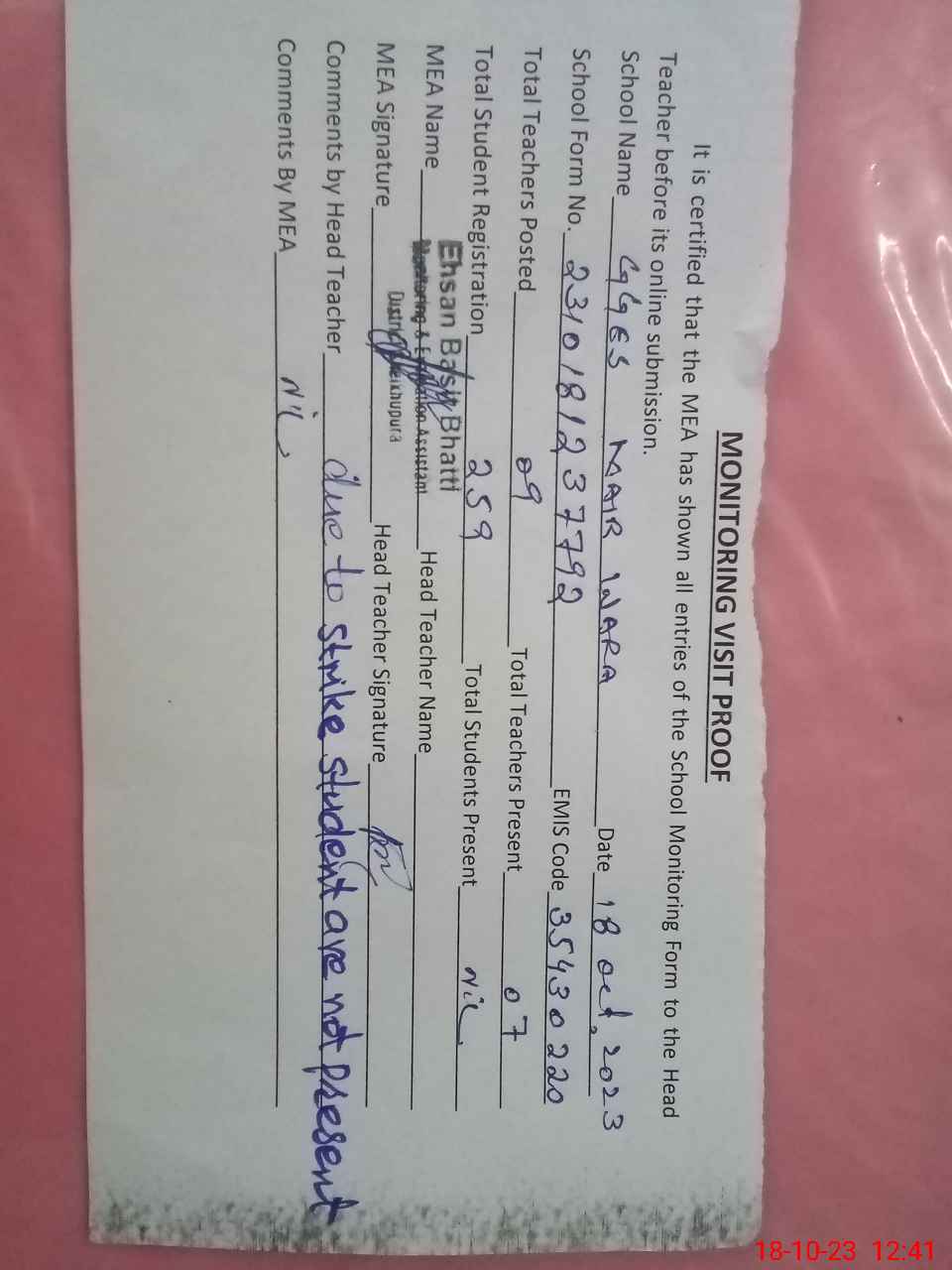 | Attendance Register | Head Teacher | MEA with School | Visit Proof |
