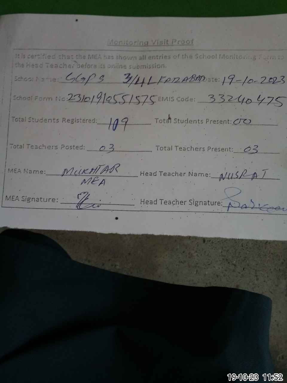 | Attendance Register | Head Teacher | MEA with School | Visit Proof |