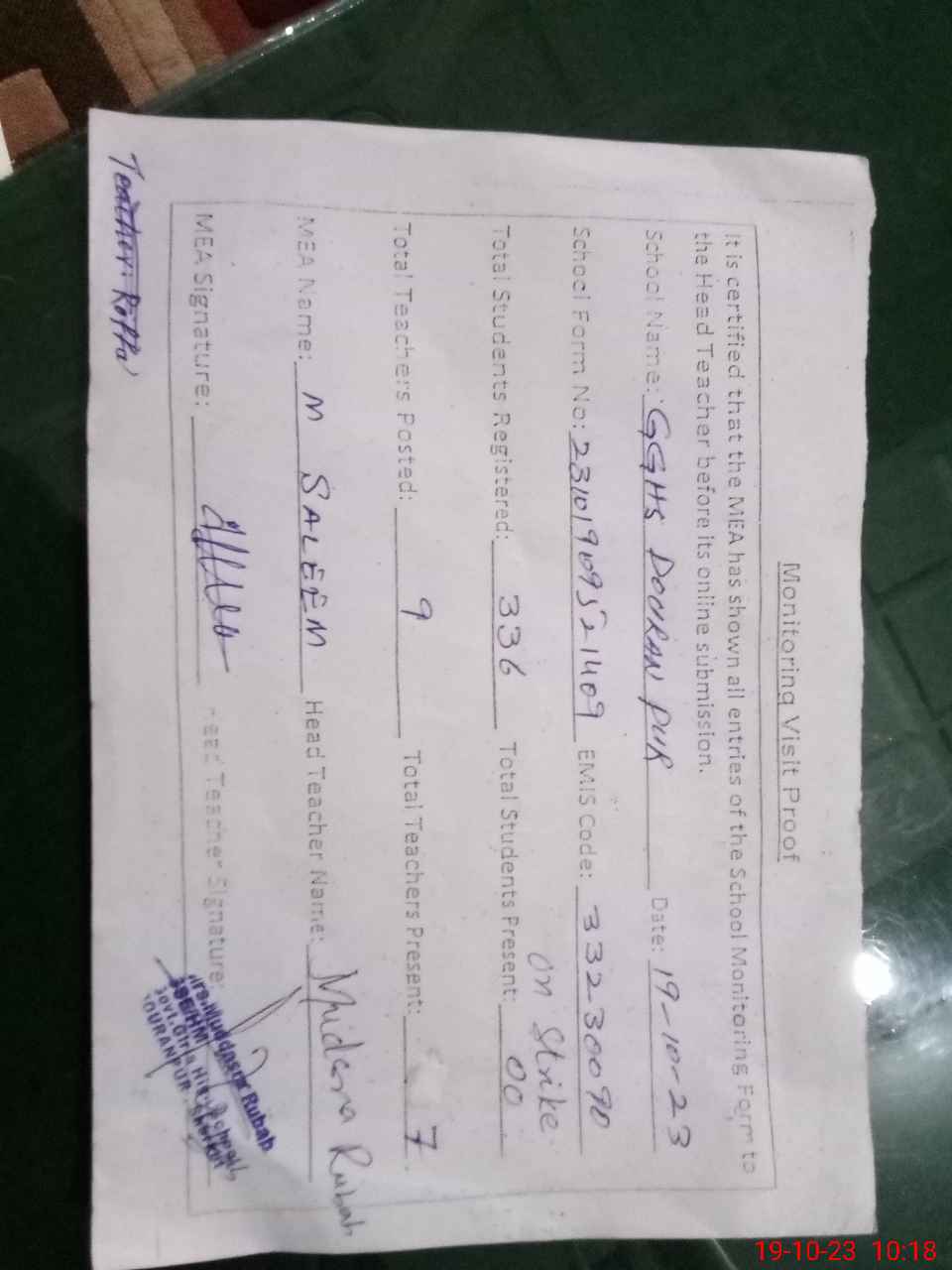 | Attendance Register | Head Teacher | MEA with School | Visit Proof |