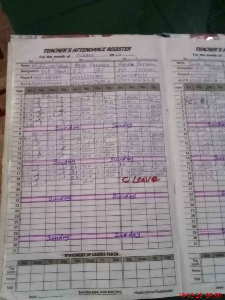 | CNIC | Full Name | Designation | R/C | Absence During Last Calender Month |