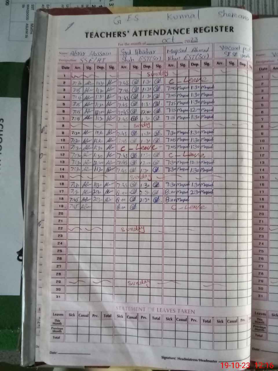 | Leave | Duty | Absent | Maternity | Medical | Ex- Pak |