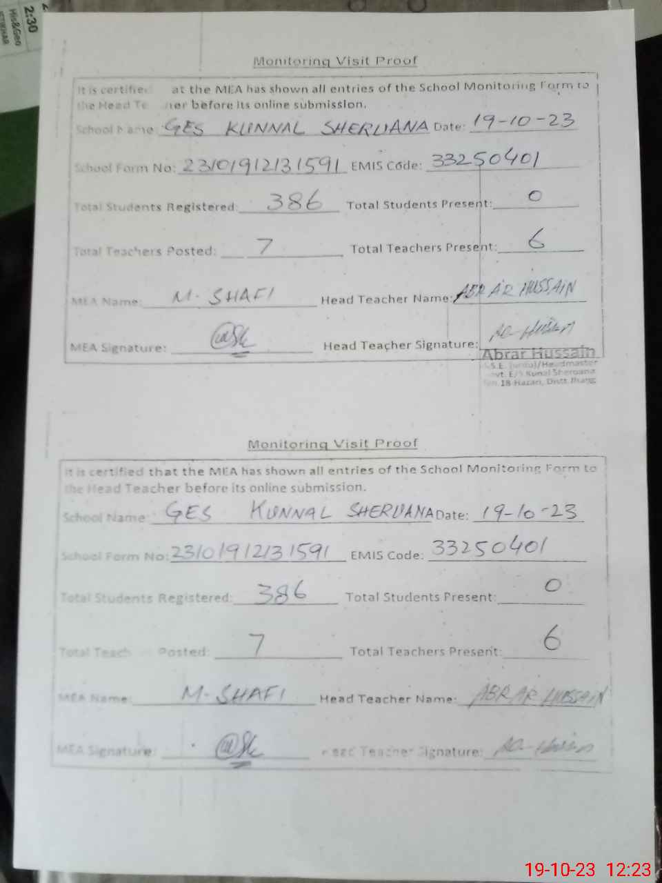| Attendance Register | Head Teacher | MEA with School | Visit Proof |