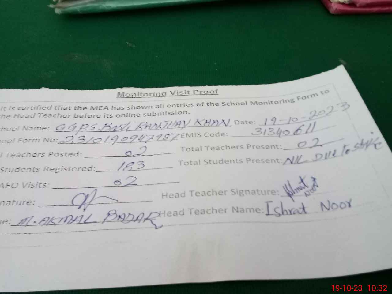 | Attendance Register | Head Teacher | MEA with School | Visit Proof |
