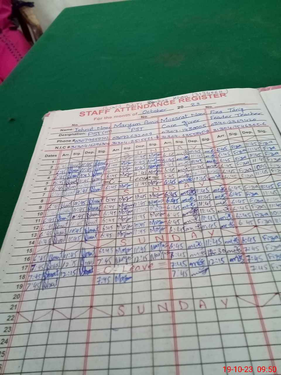 | CNIC | Full Name | Designation | R/C | Absence during last cal. month |