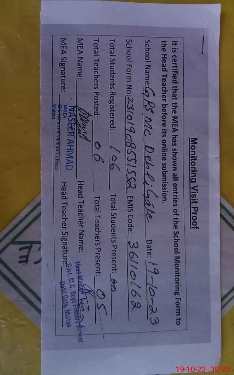 | EMIS Code: 36110162 | Name of School: GPS MC DEHLI GATE MULTAN | |||