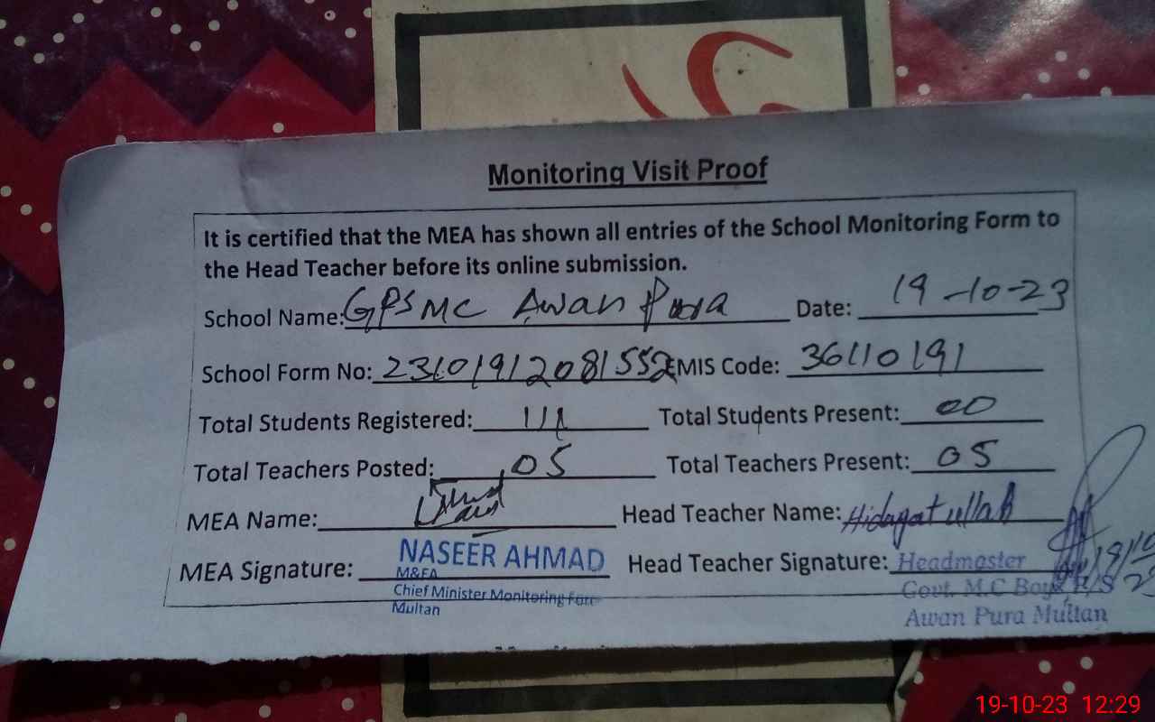 | Certified that this School was Inspected by the Undersigned MEA/DMO Today and the Information Stated Above is as Per Record. | |||||