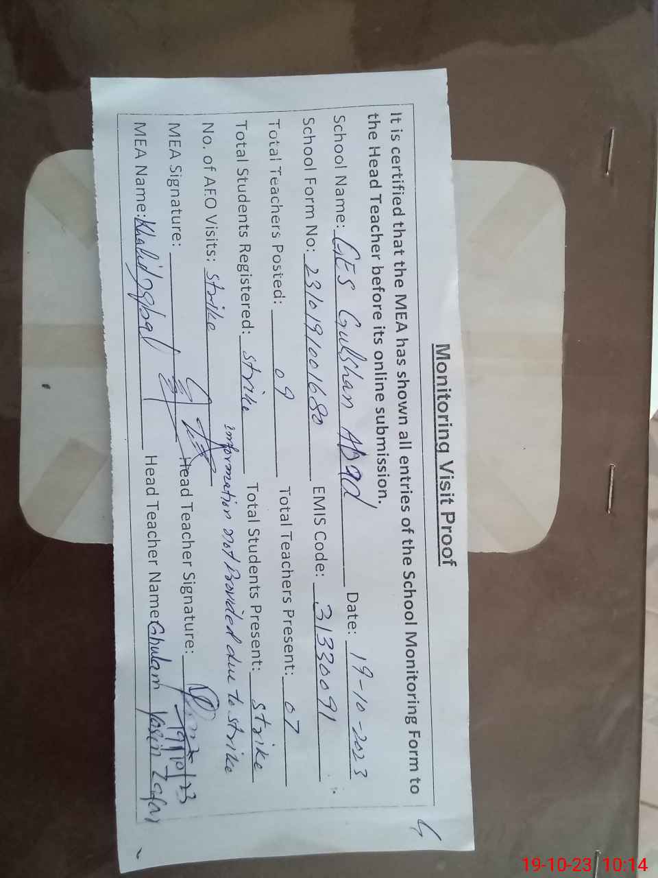 | Attendance Register | Head Teacher | MEA with School | Visit Proof |