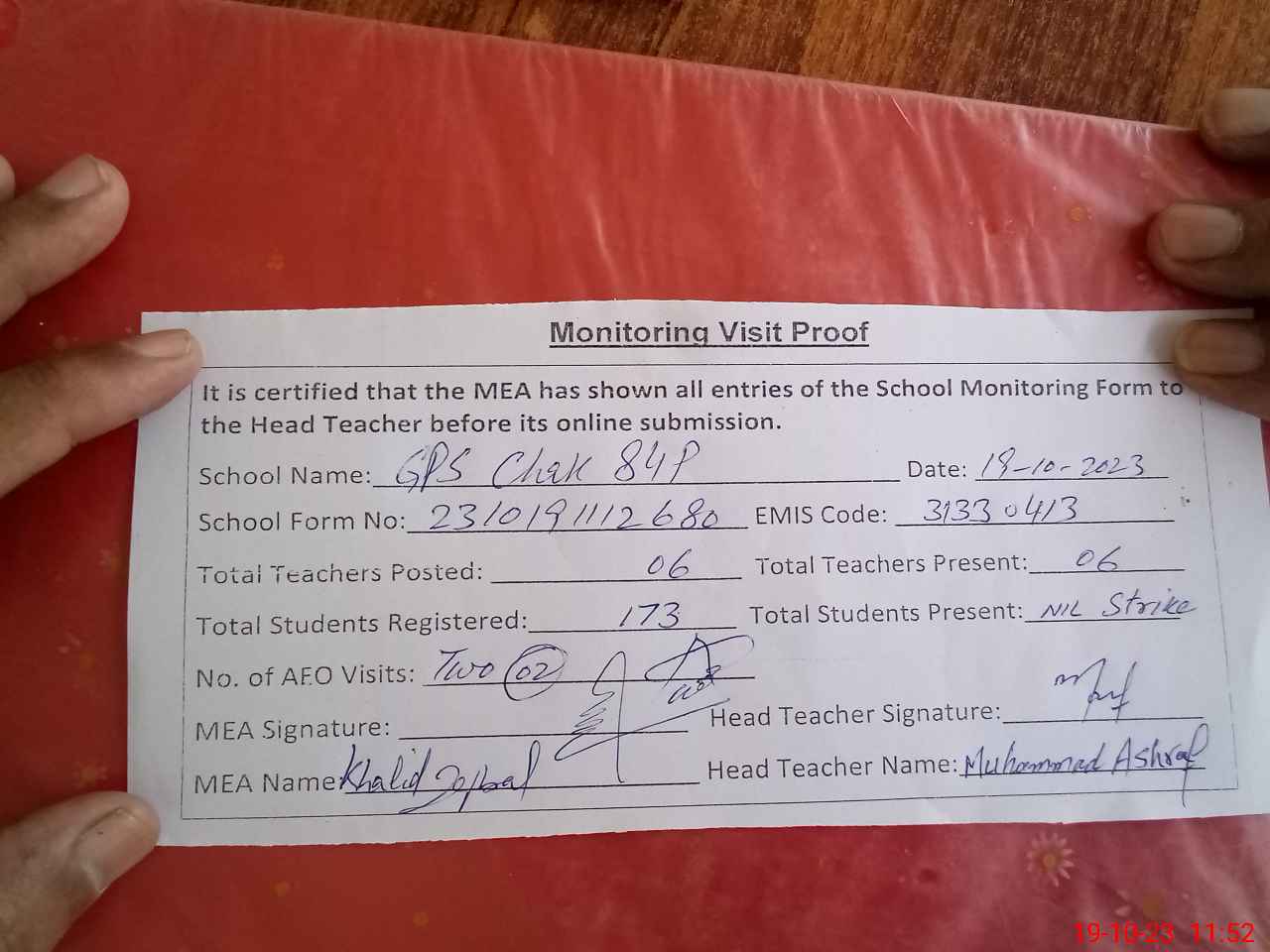 | Attendance Register | Head Teacher | MEA with School | Visit Proof |
