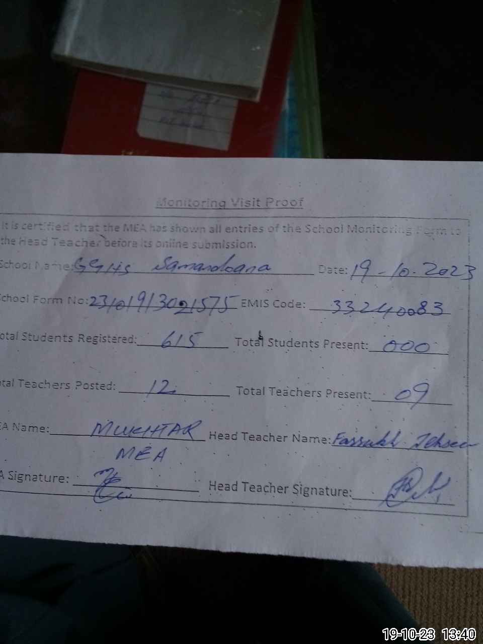 | Attendance Register | Head Teacher | MEA with School | Visit Proof |