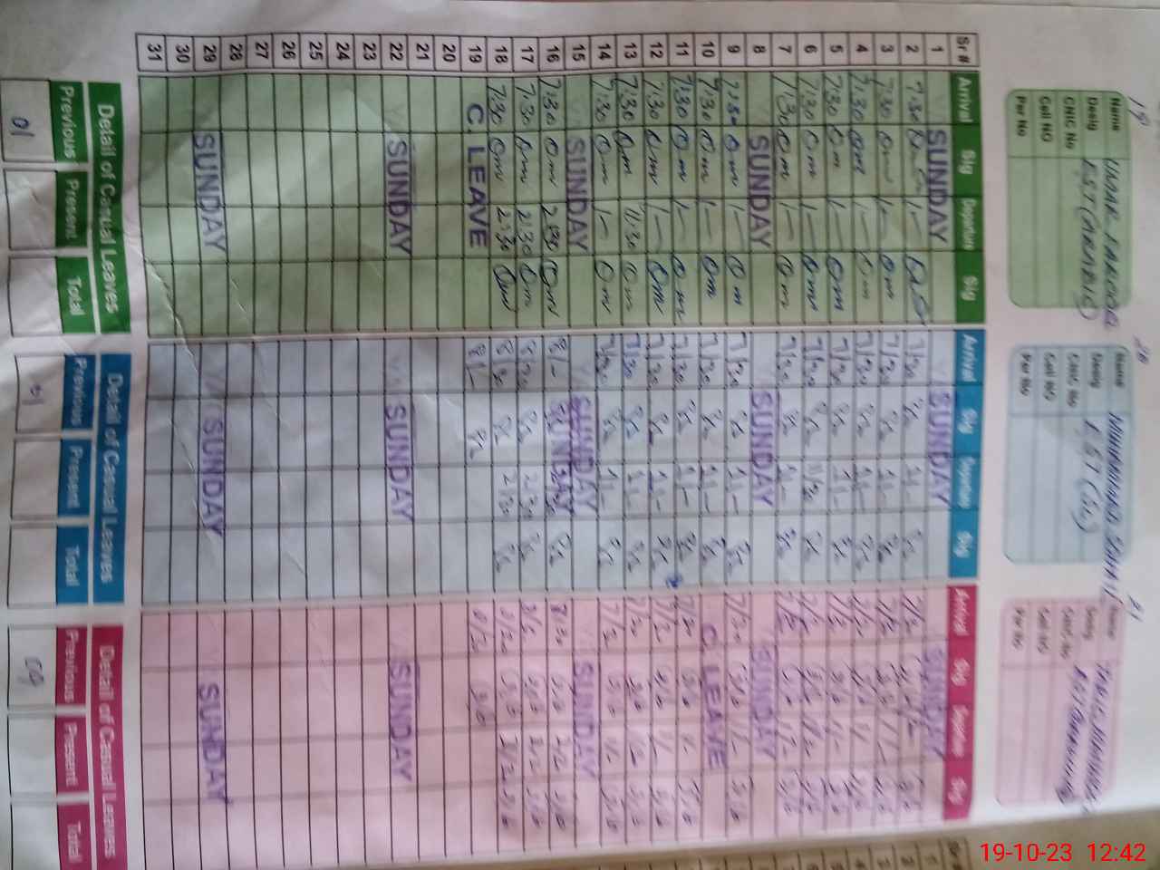 | CNIC | Full Name | Designation | R/C | Absence During Last Calender Month |