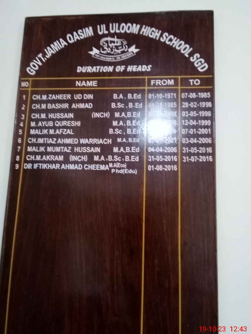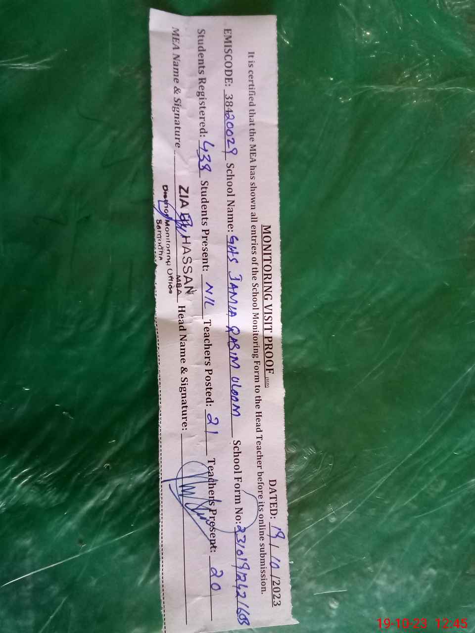 | EMIS Code: 38420029 | Name of School: GHS JAMIA QASIM UL ULOOM JINNAH COLONY | |||