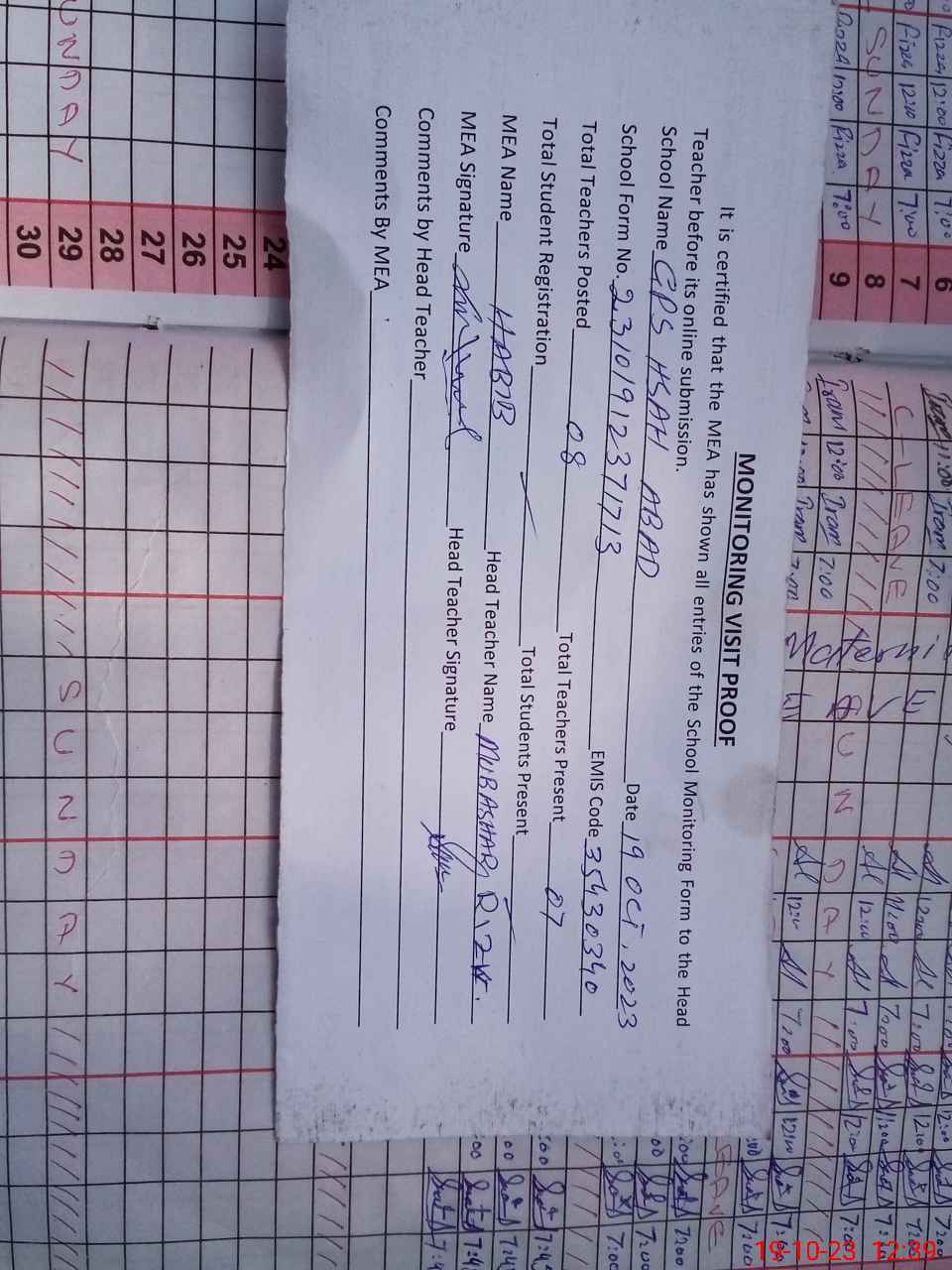 | Attendance Register | Head Teacher | MEA with School | Visit Proof |