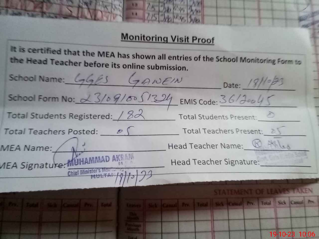 | Attendance Register | Head Teacher | MEA with School | Visit Proof |