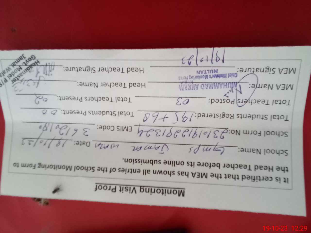 | Certified that this School was Inspected by the Undersigned MEA/DMO Today and the Information Stated Above is as Per Record. | |||||