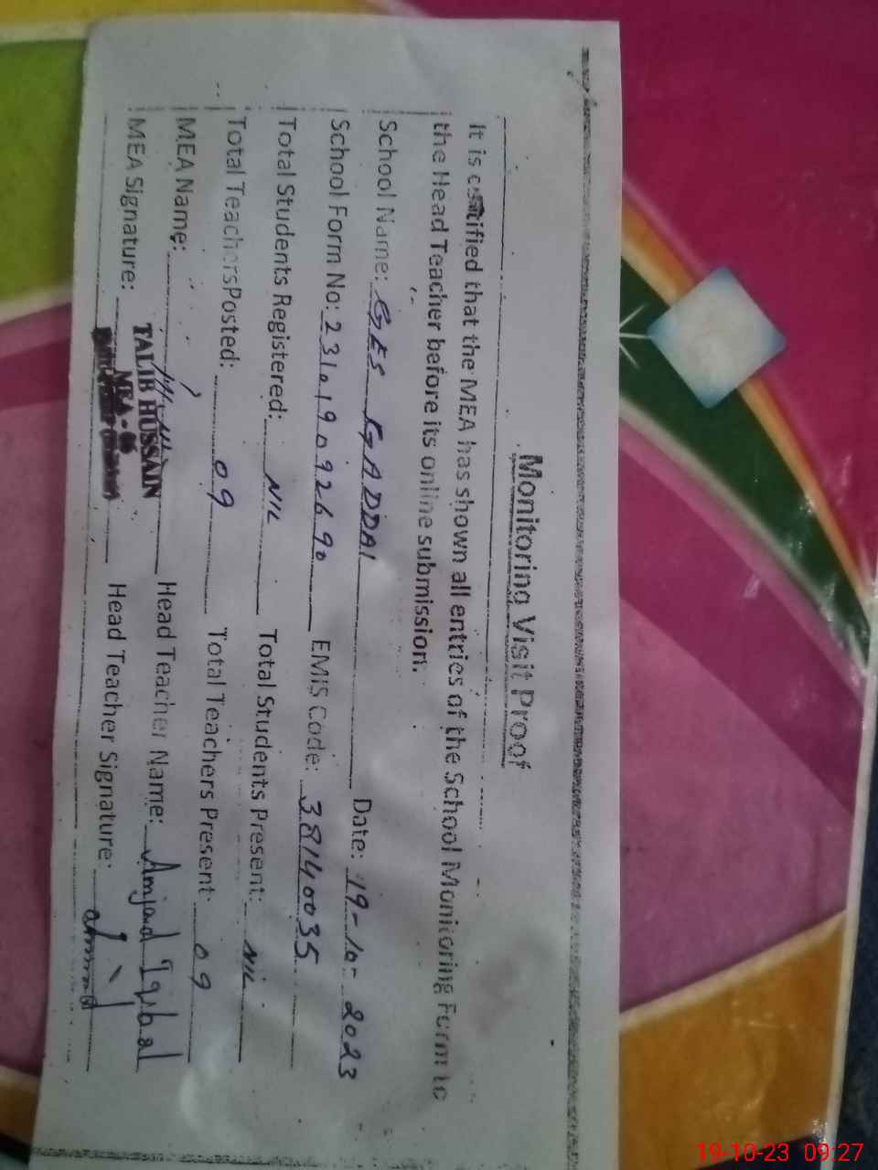 | Attendance Register | Head Teacher | MEA with School | Visit Proof |