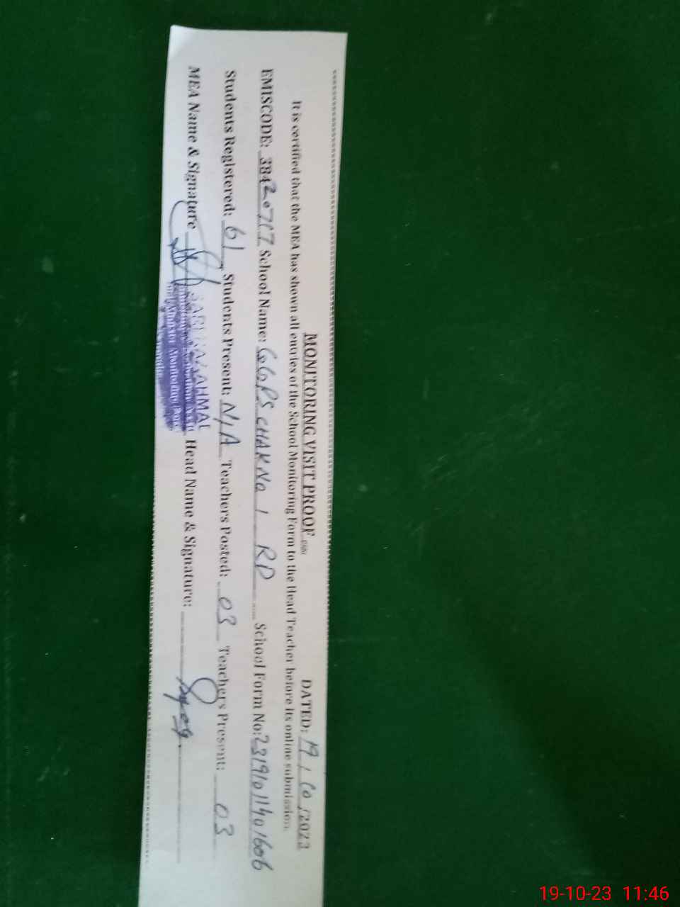 | Certified that this School was Inspected by the Undersigned MEA/DMO Today and the Information Stated Above is as Per Record. | |||||