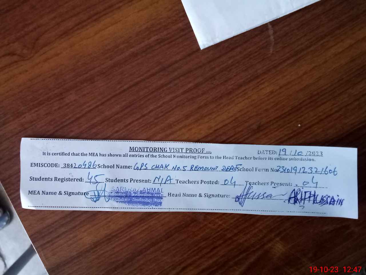 | EMIS Code: 38420486 | Name of School: GPS CHAK NO.5 REMOUNT DEPOT | |||