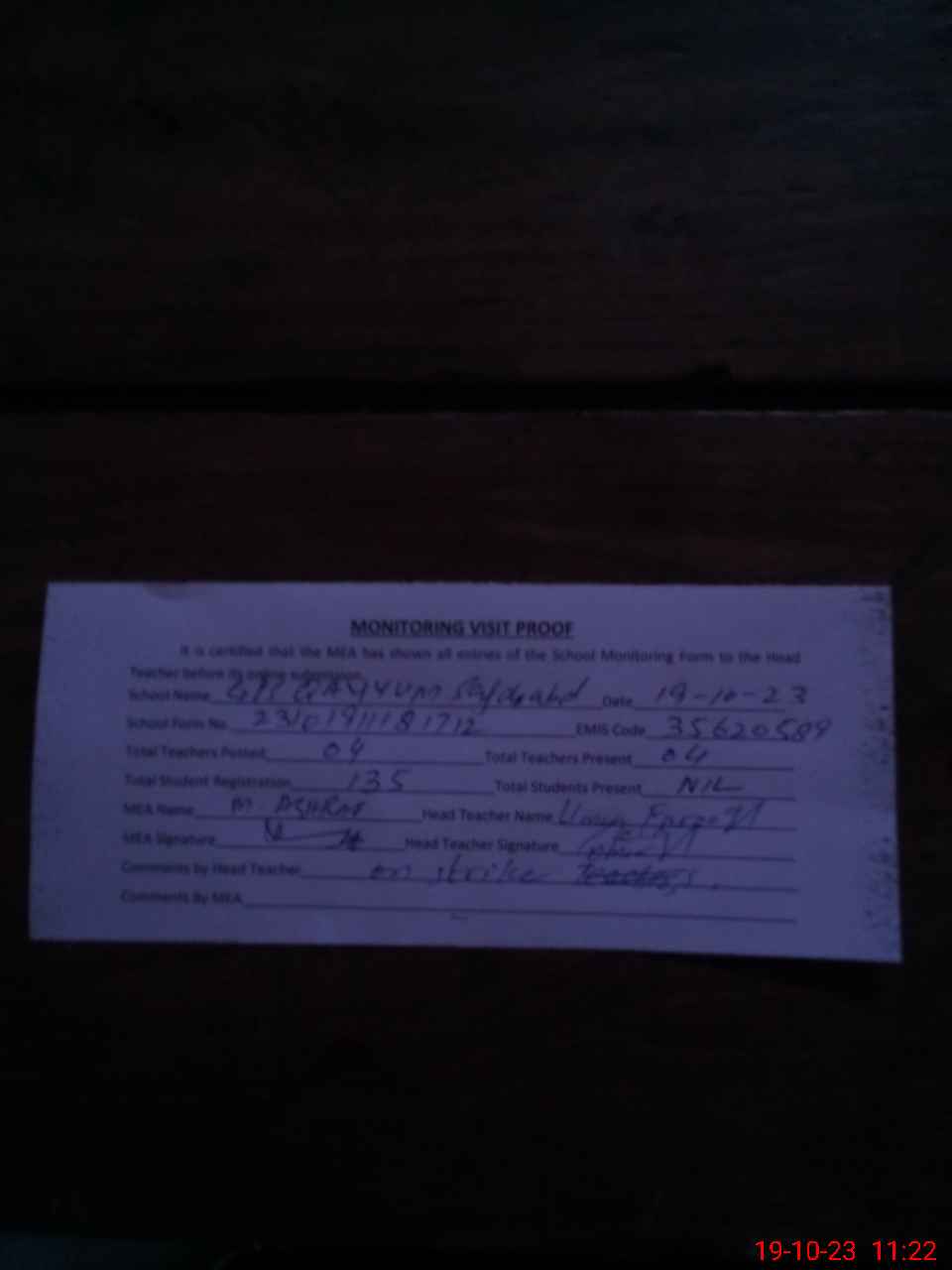 | Attendance Register | Head Teacher | MEA with School | Visit Proof |
