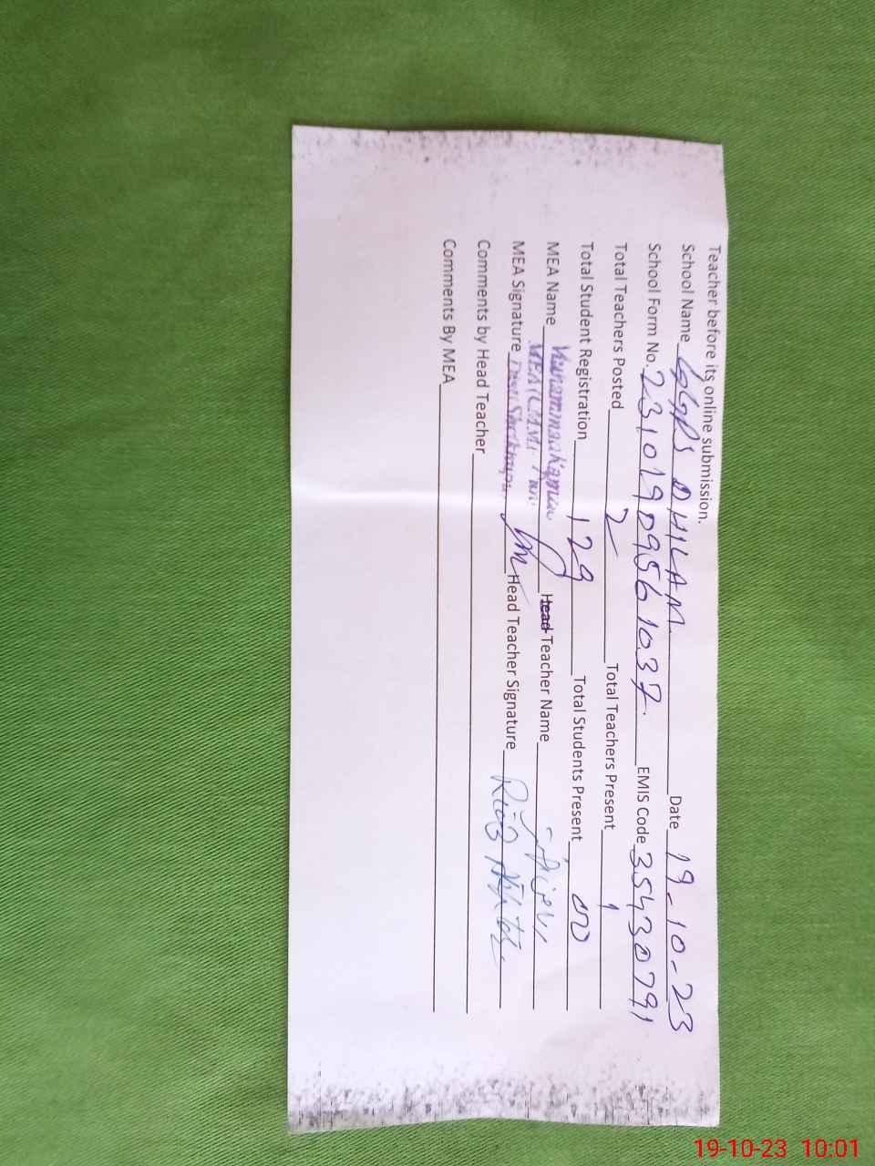 | Attendance Register | Head Teacher | MEA with School | Visit Proof |