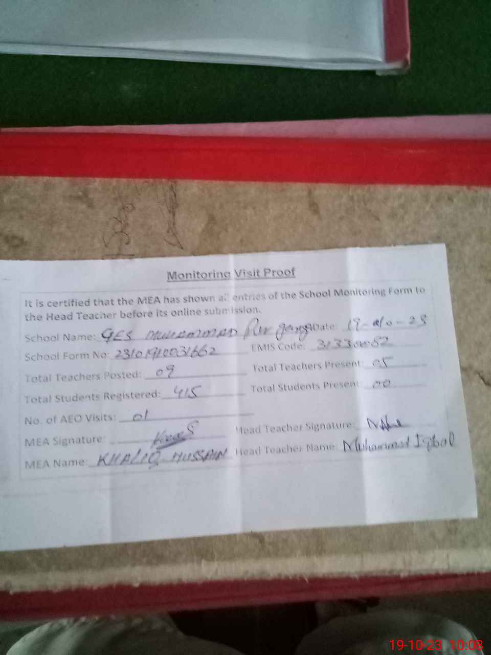| Attendance Register | Head Teacher | MEA with School | Visit Proof |