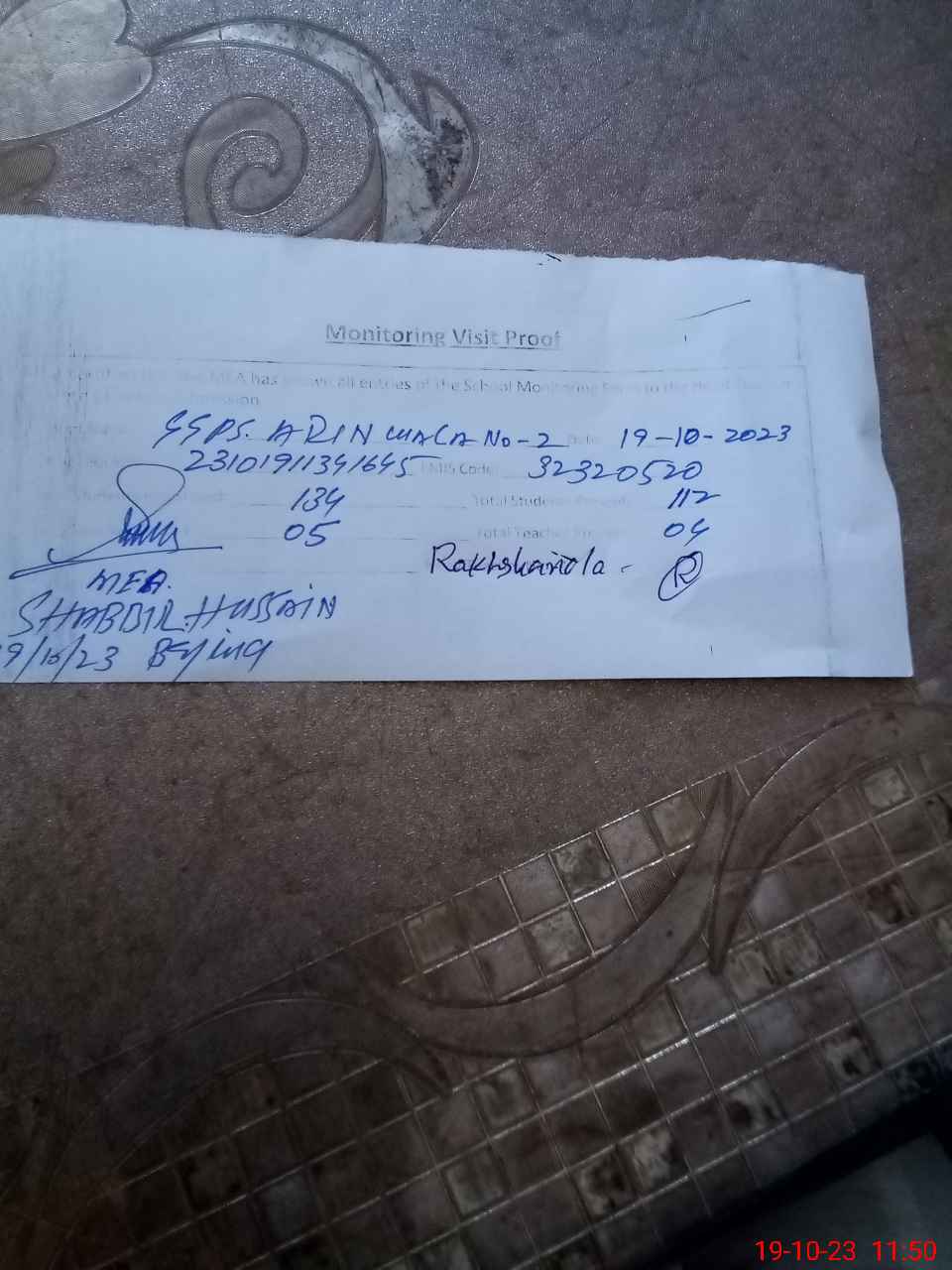 | Monitoring Date: 19-10-2023 | Start Time: 19-10-2023 10:58 AM | End Time: 19-10-2023 11:50 AM | Name of MEA: SH**** HU**** | |