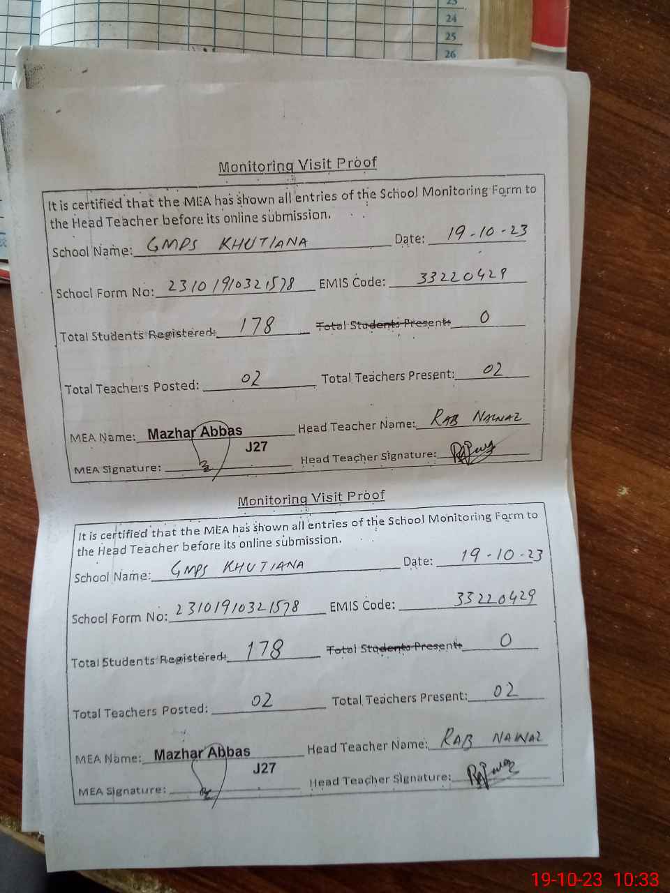 | Attendance Register | Head Teacher | MEA with School | Visit Proof |