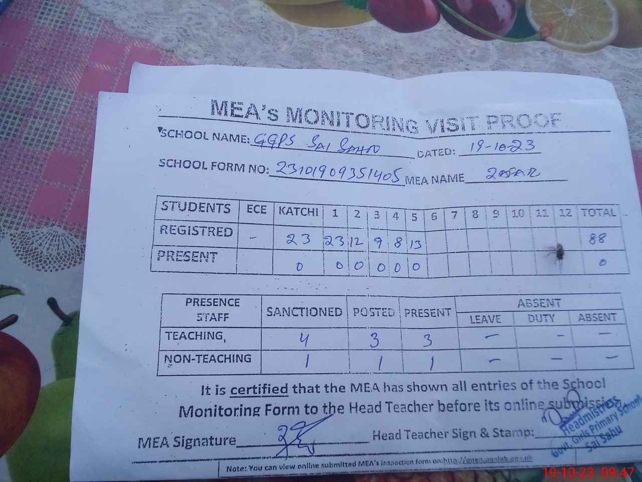 | Attendance Register | Head Teacher | MEA with School | Visit Proof |