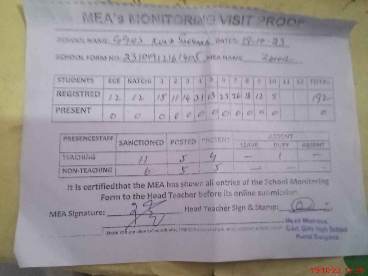 | Attendance Register | Head Teacher | MEA with School | Visit Proof |
