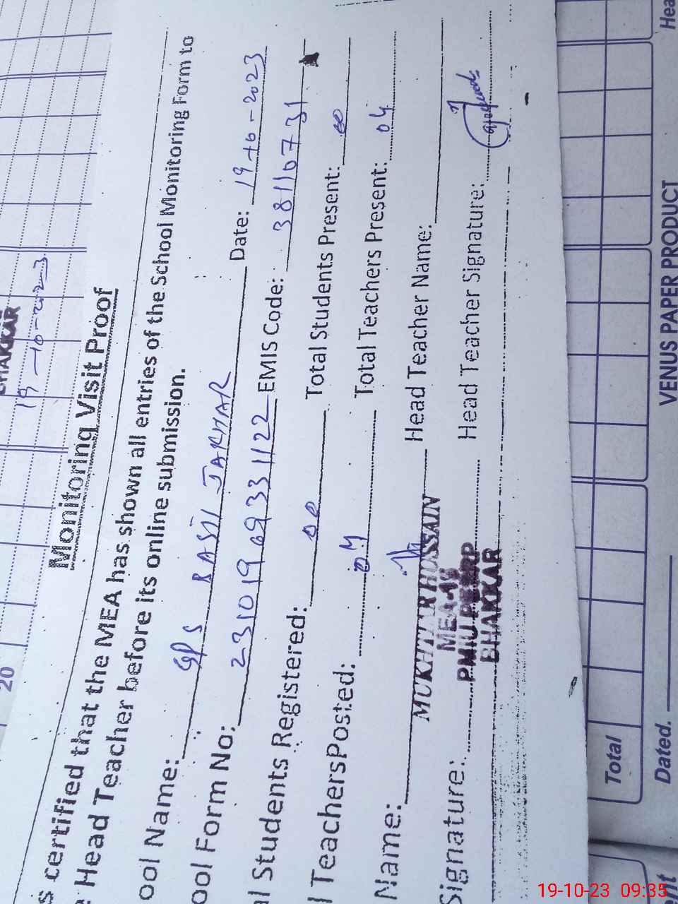| Certified that this School was Inspected by the Undersigned MEA/DMO Today and the Information Stated Above is as Per Record. | |||||