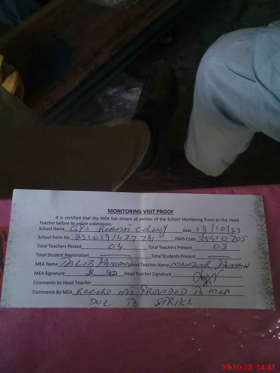 | EMIS Code: 35410705 | Name of School: GPS REHMAT COLONY FEROZWALA | |||