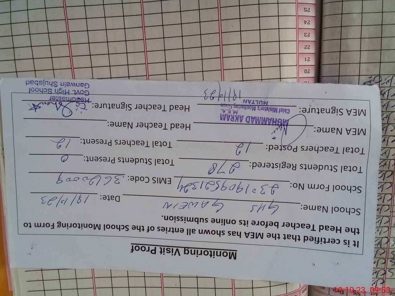 | Certified that this School was Inspected by the Undersigned MEA/DMO Today and the Information Stated Above is as Per Record. | |||||