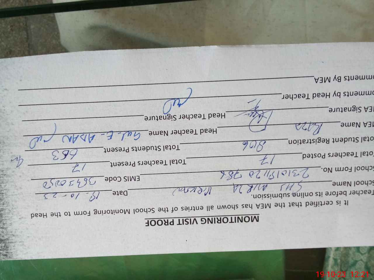 | Attendance Register | Head Teacher | MEA with School | Visit Proof |