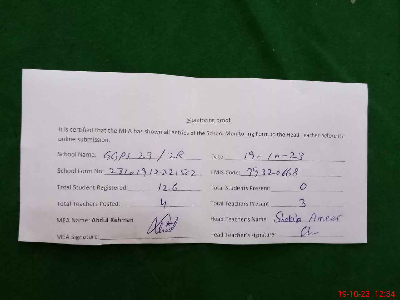 | Attendance Register | Head Teacher | MEA with School | Visit Proof |