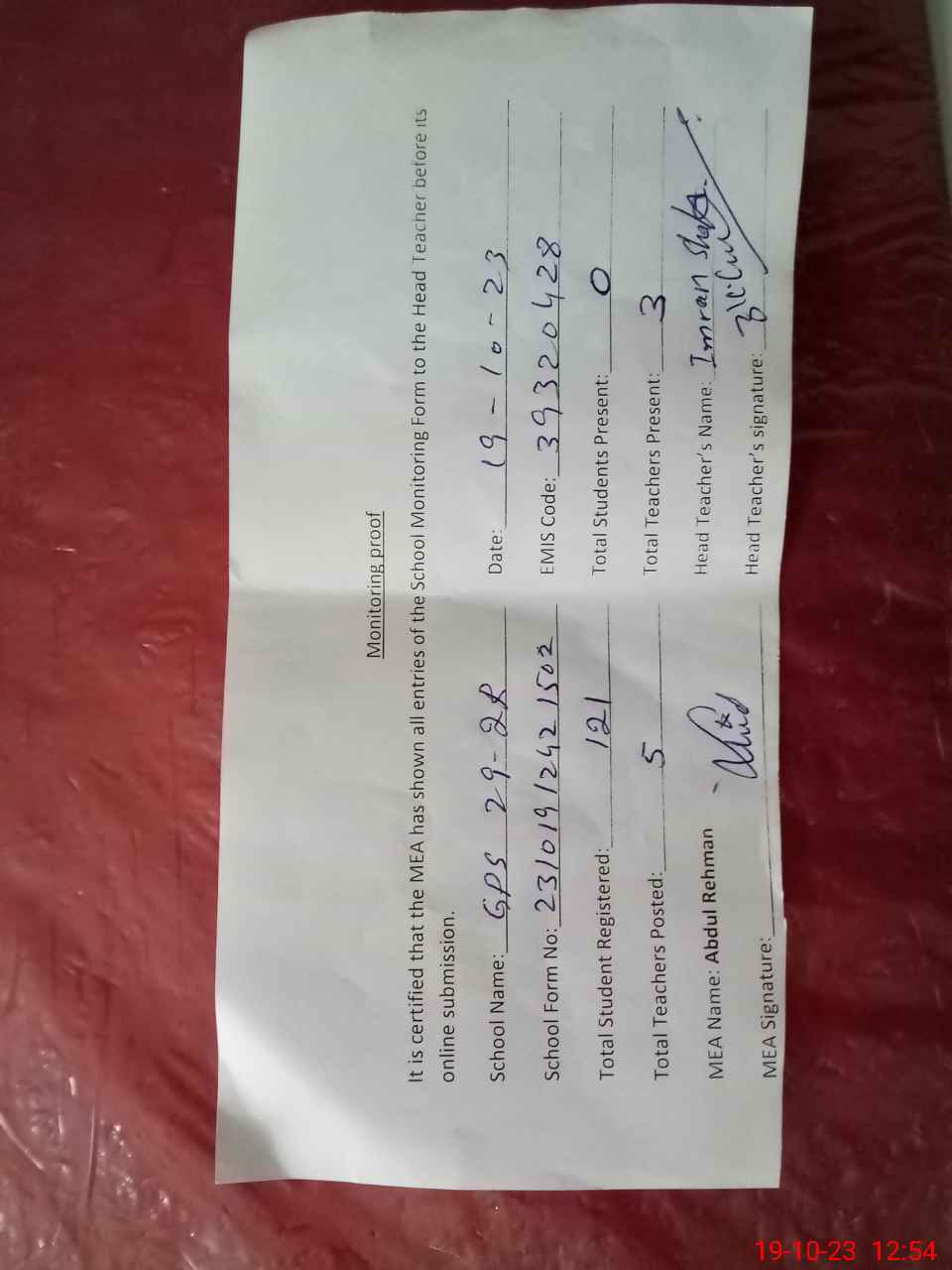 | Attendance Register | Head Teacher | MEA with School | Visit Proof |