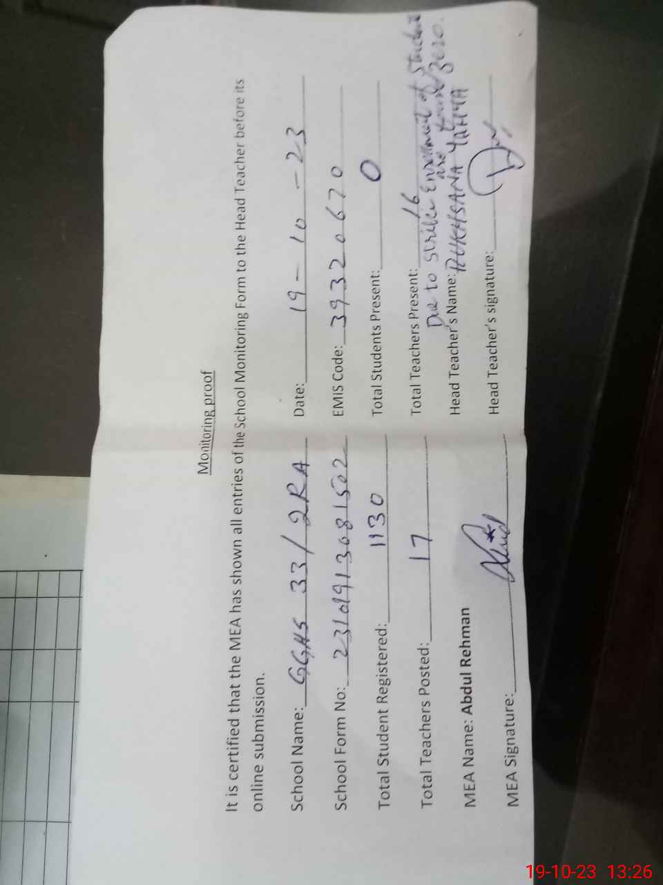 | Remarks (Use Separate Page if Required): Teaching staff found present but Head teacher refused to provide required data Submitted for the information of higher authorities please | |||||