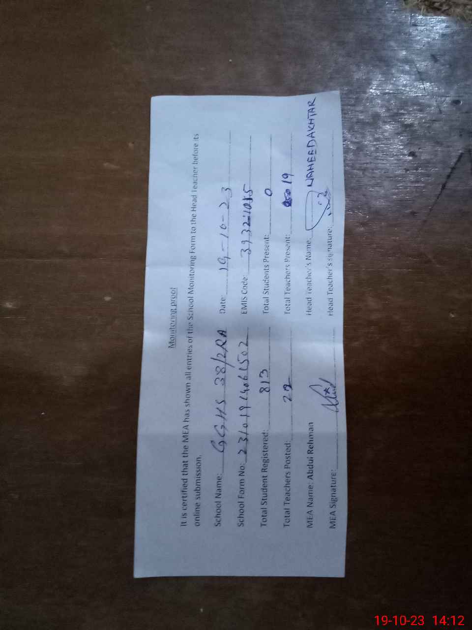| Attendance Register | Head Teacher | MEA with School | Visit Proof |