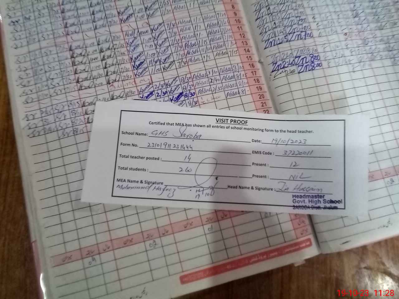 | Remarks (Use Separate Page if Required): Sir GHS Saroba 37220011 teacher were present 12 but students were not present | |||||