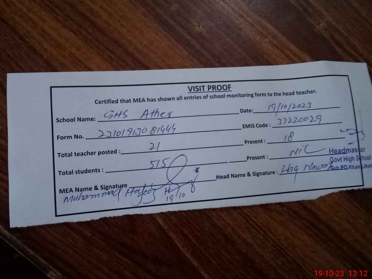 | Remarks (Use Separate Page if Required): Sir GHS Ather 37220029 teacher present 18 students not present | |||||