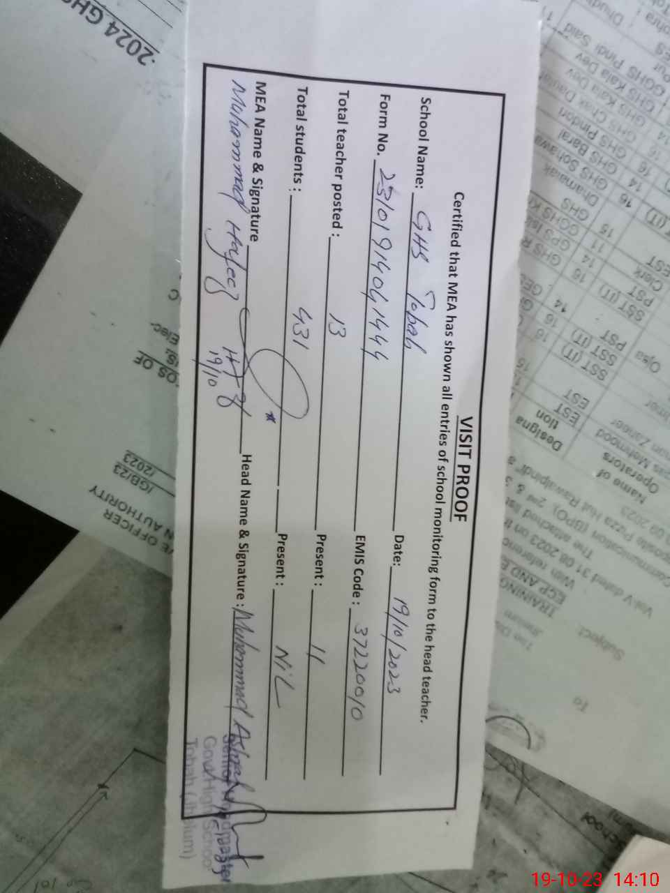 | Remarks (Use Separate Page if Required): Sir GHS Tobah 37220010 only teacher was present students were not present | |||||