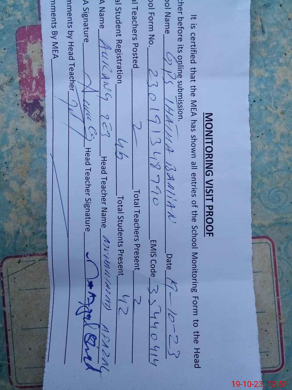| Attendance Register | Head Teacher | MEA with School | Visit Proof |