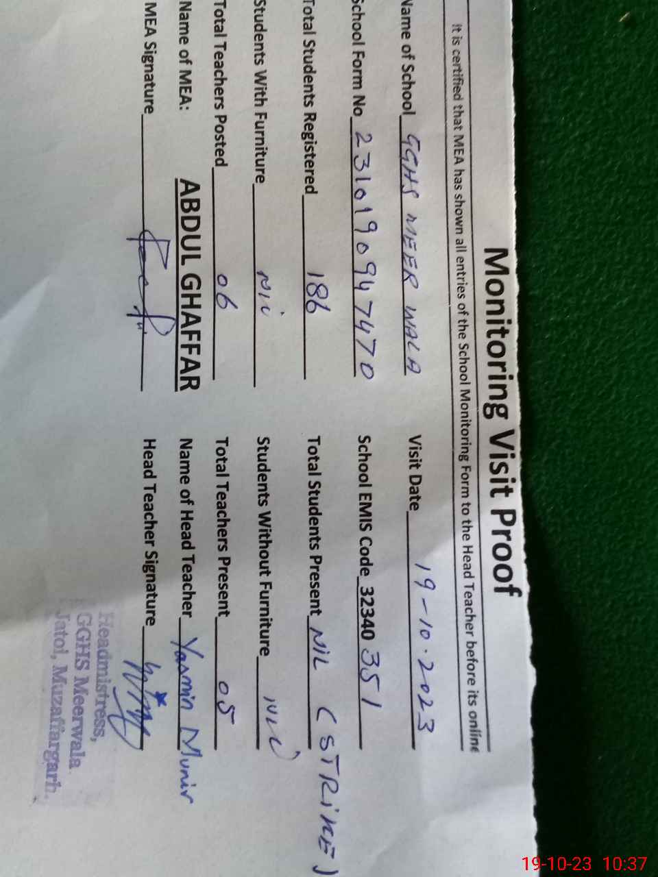 | EMIS Code: 32340351 | Name of School: GGHS MEER WALA | |||
