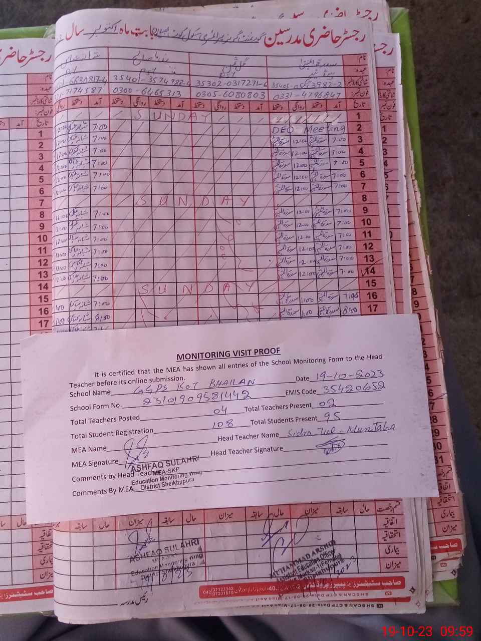 | Attendance Register | Head Teacher | MEA with School | Visit Proof |