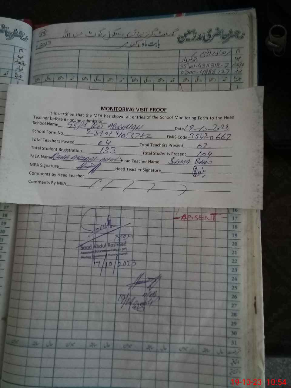 | Attendance Register | Head Teacher | MEA with School | Visit Proof |